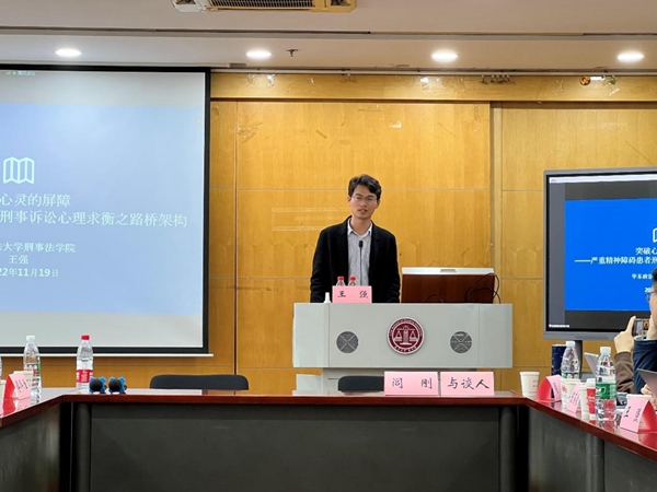 本单元第二位发言人为华东政法大学刑事法学院司法鉴定专业硕士研究生王强同学,其报告题目为《突破心灵的屏障——严重精神障碍患者刑事诉讼心理求衡之路桥架构》。他认为严重精神障碍患者刑事案件中,各诉讼参与人存在不同心理:被告人可能存在悔罪、侥幸抵赖、依赖、抗衡的心理,法定代理人可能存在气愤、无奈、焦虑甚至绝望的情绪,辩护人会产生同情、对自己人身安全的担忧、对被告人表现的焦灼等复杂心理,被害人一般会表现正常,也可能对被告人产生恐惧、报复或是同情的情绪。基于以上情况,法官要承担作为法律人、社会人的责任,引导、转化公诉人的优越、矛盾冲突心理,通过举证来应对被告人的抗拒狡辩心理,面对受害人的强烈情绪,法官需保持理性,面对法定代理人与辩护人将“精神病”认为是无罪理由的错误观点,法官需提醒并阐述判决理由。同时,在庭审与执行两环节开展全方位心理融通:在庭审中,表现出诚意、理解,向各方分别说理阐述,实现共赢;针对强制医疗执行程序中的不足,法官需进行效力上的把控。其次,法官需进行心理矫正之架构衔接:在诉讼前,积极引入精神障碍患者心理评估机制;在诉讼中,借鉴精神卫生法庭模式,集合各方力量加强沟通;在诉讼后,增加判后心理调适环节。