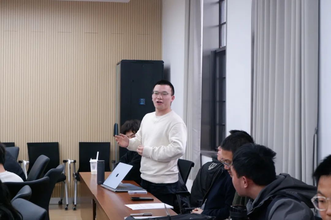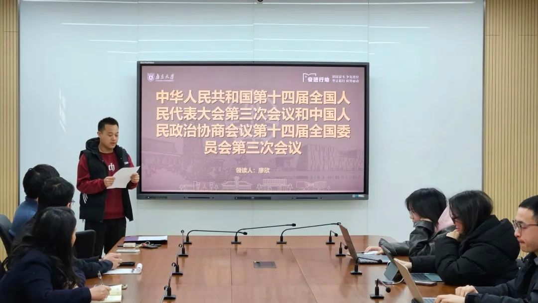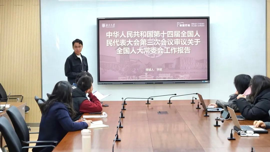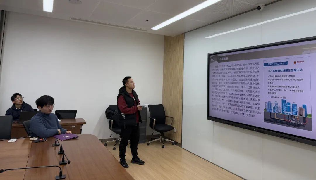 活动伊始,领读人廖欣同学结合国务院总理李强在第十四届全国人大三次会议所作的《政府工作报告》,带领大家深入回顾了2024年我国经济社会发展取得的非凡成绩以及2025年的主要目标、工作任务和宏观政策要点。廖欣同学的报告中既包含“三农”工作、财政政策、社会保障等传统重要议题,也特别谈及了加快建设现代化产业体系、培育壮大新兴产业和未来产业等新方向。廖欣同学提到,真正的“热点”常常蕴含在国家政策部署和报告文件中,希望同学们在选题和研究过程中,将自身学术兴趣与国家战略需求结合起来,聚焦国家“真热点”,让学术研究“有抓手”。