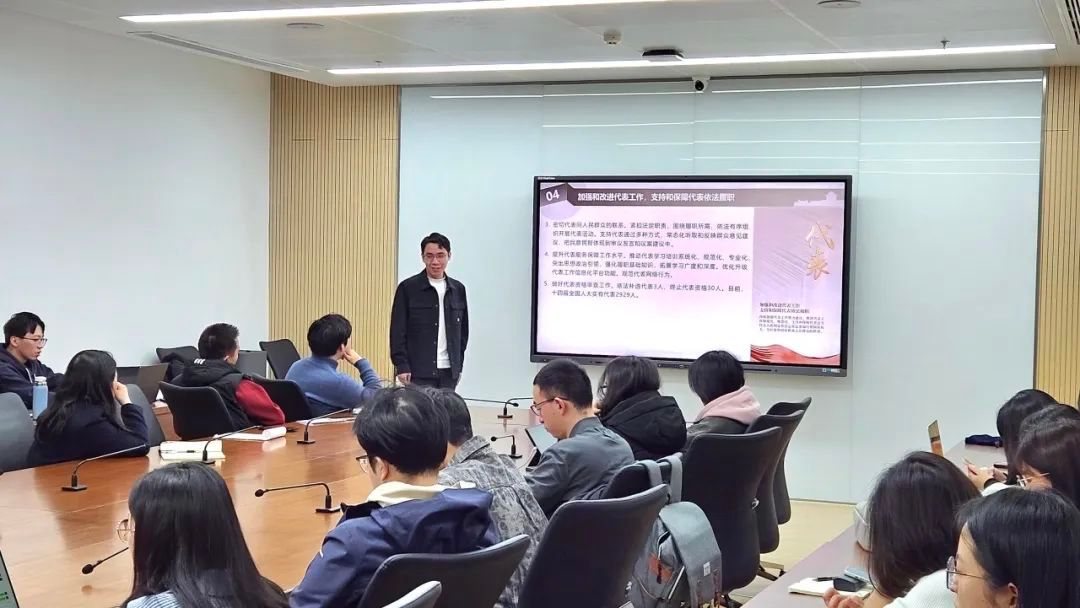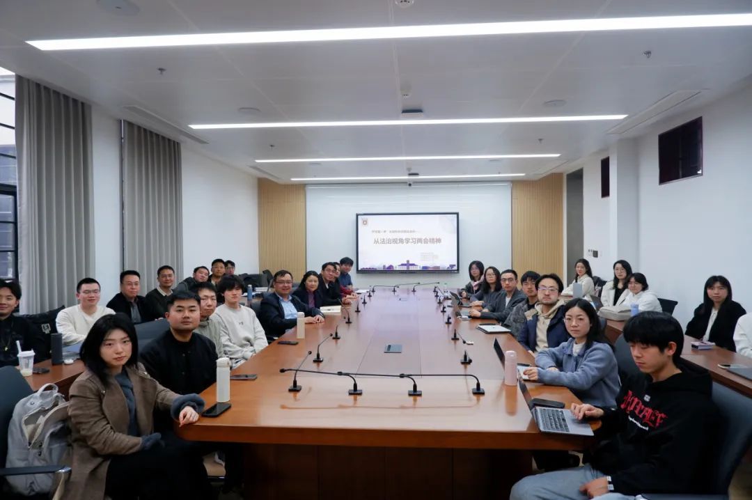 在学习心得交流环节,徐恭平、李亚铎、陈映璇三位同学分别结合自身研究方向与对两会精神的理解,分享了对于博士担当与时代使命、涉外法治与全球视野等问题的感悟。法学博士生应当紧扣国家发展脉搏,关注社会实际问题,以法治思维推动社会进步。青年一代应当踔厉奋发、踊跃前行、不负使命,要在高质量发展浪潮中主动谋划,自觉将个人成长融入民族复兴的大局。