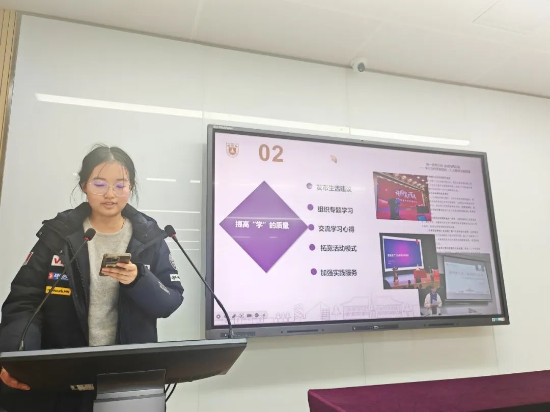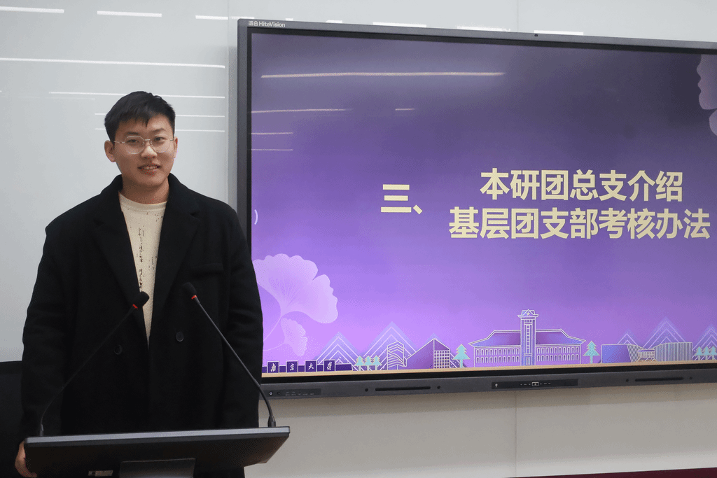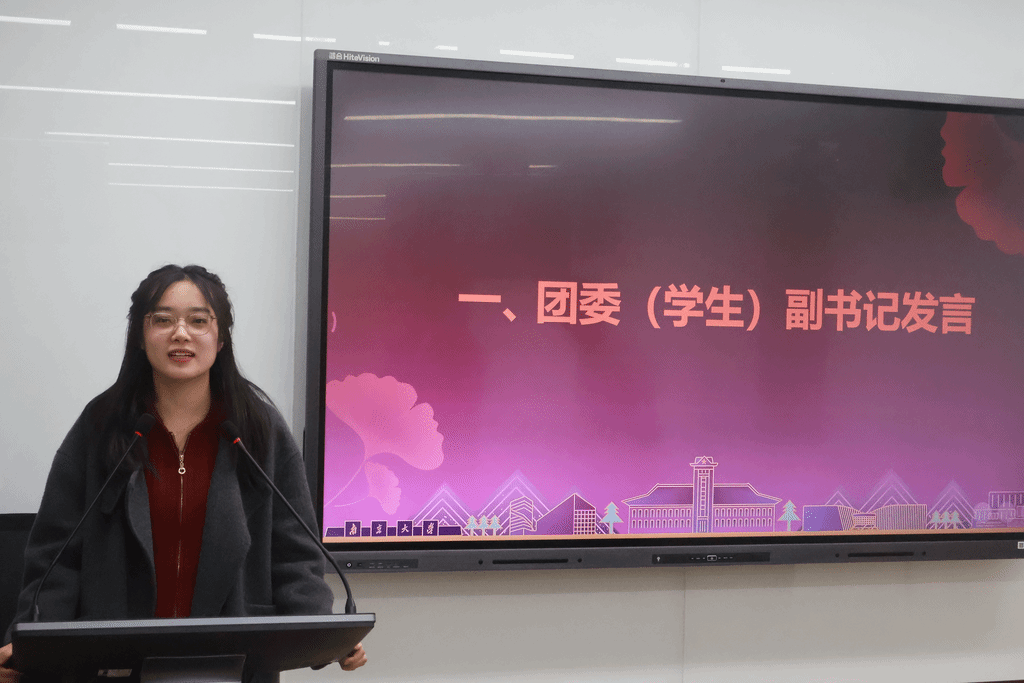 接着,本科生团总支学生代表丁曜同学围绕基层团支部管理与考核工作发言。丁曜全面介绍了本学期团总支在学社衔接、入党积极分子推优等方面的工作成效,并对新颁布的《成人网
