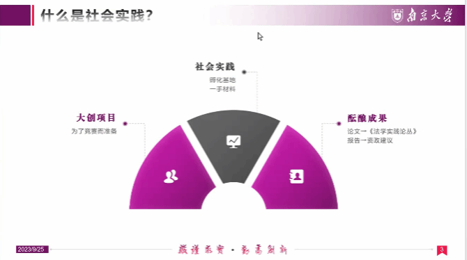 高嘉悦学姐介绍了志愿服务活动的选择、信息获取及组织方式等。史颖姿学姐分享了模拟法庭比赛和实践活动的经历与经验,深度解析简历投递与面试策略。胡志成学长介绍了社会实践的评价维度与实践策略、数据挖掘与定量方法在实践中的应用等。曲咨丞学长则围绕保研分享了专业课程学习经验、应试策略等。