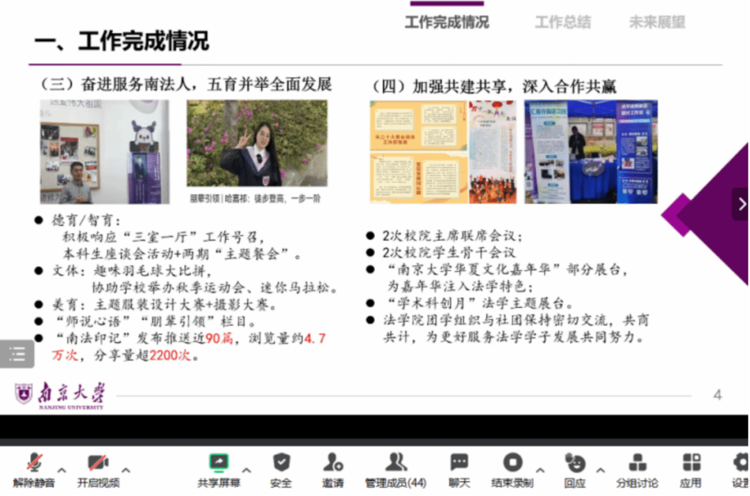她从“坚定不移跟党走”“聚焦需求”“奋进服务”“共建共享”四个方面总结了法学院学生会的工作成果。她指出,院会始终坚持思想政治引领,坚持以同学需求为导向,结合法学院特色举办精品化、系列化品牌活动,服务于南大法科生的全面发展。未来,院会将继续以昂扬的斗志、饱满的热情助力南大青年式奋进,团结带动南法院会和同学驰骋青春赛道,为营造美好校园生活,助力同学成长成才不断努力。