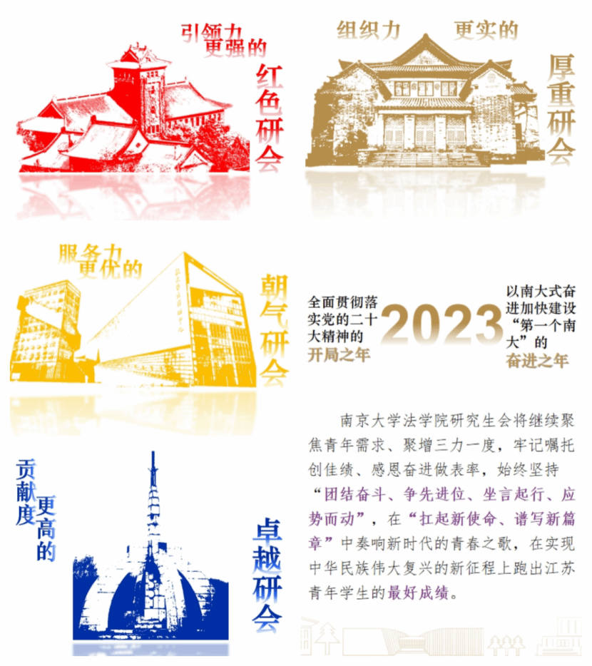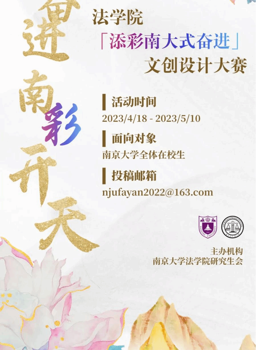 分别举办法学院“添彩南大式奋进”文创设计大赛和法学院“描绘南大人奋进青春”研会标识设计大赛,鼓励全体同学发挥创造力和想象力,描绘南法青年心中的“南大式奋进”图景,传达对法学院研会最深刻的期望与嘱托。同学们积极参与设计大赛,反响热烈,宣扬了法学院在“南大式奋进”格局下的全新风貌。