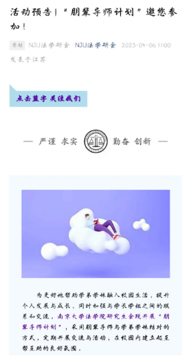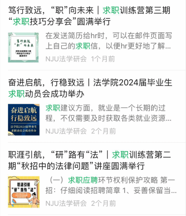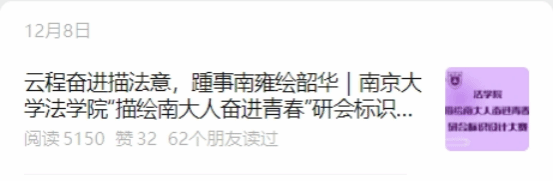 高度重视融媒体、全平台宣传工作,以“NJU法学研会”作为对外主窗口,关注人数近7000人。围绕思想强基、时事聚焦发布推文逾百篇,主题包括党政活动、学生活动和求职招聘等校园生活的全领域、全方面,总阅读量超过33万次,被分享转发次数过万。其中“云程奋进描法意,踵事南雍绘韶华”成人网