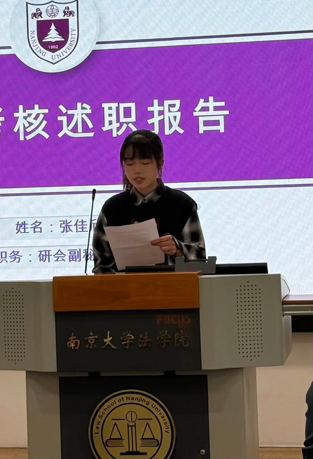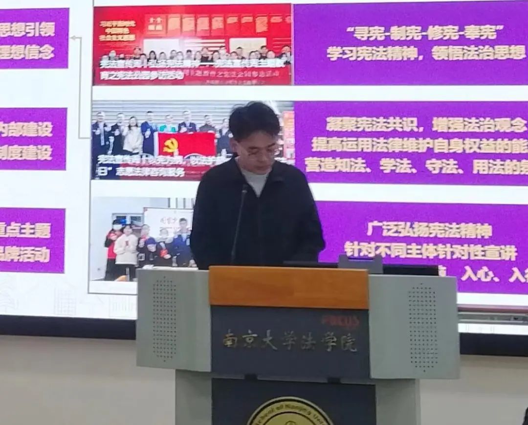 12月22日下午,法学院2023-2024学年第一学期团学组织主要学生干部述职大会于仙林校区举行。法学院党委副书记马骏老师出席并作点评讲话。法学院全体辅导员老师、班主任和德育导师代表出席活动。会议由院团委书记路敏玥老师主持。