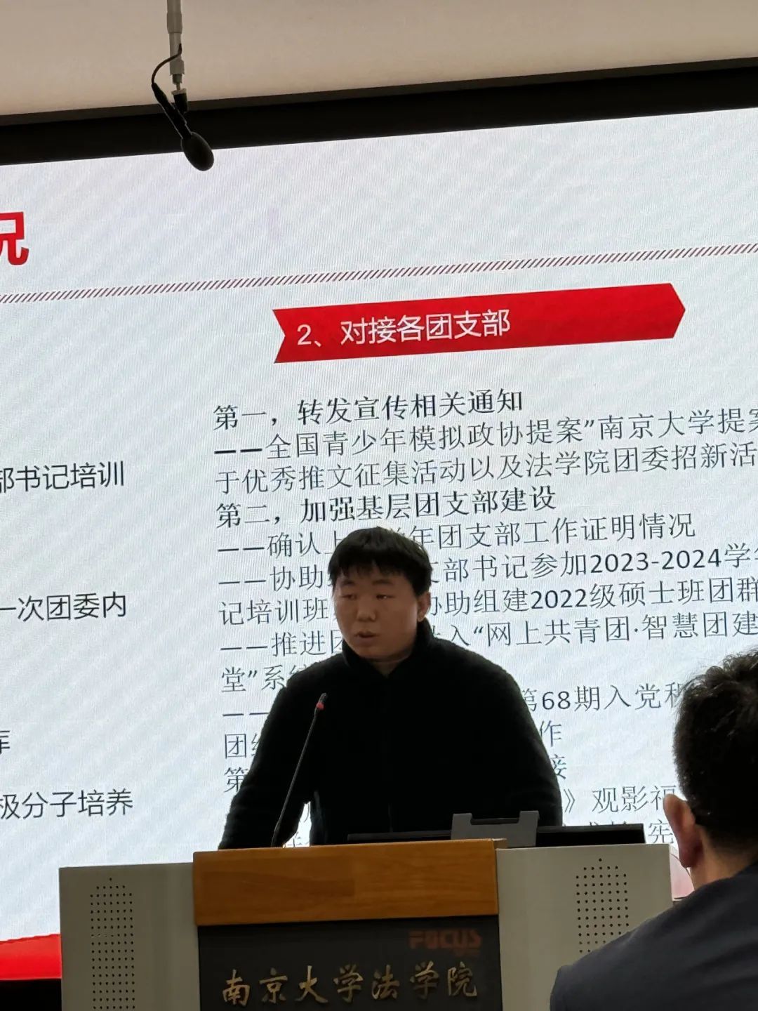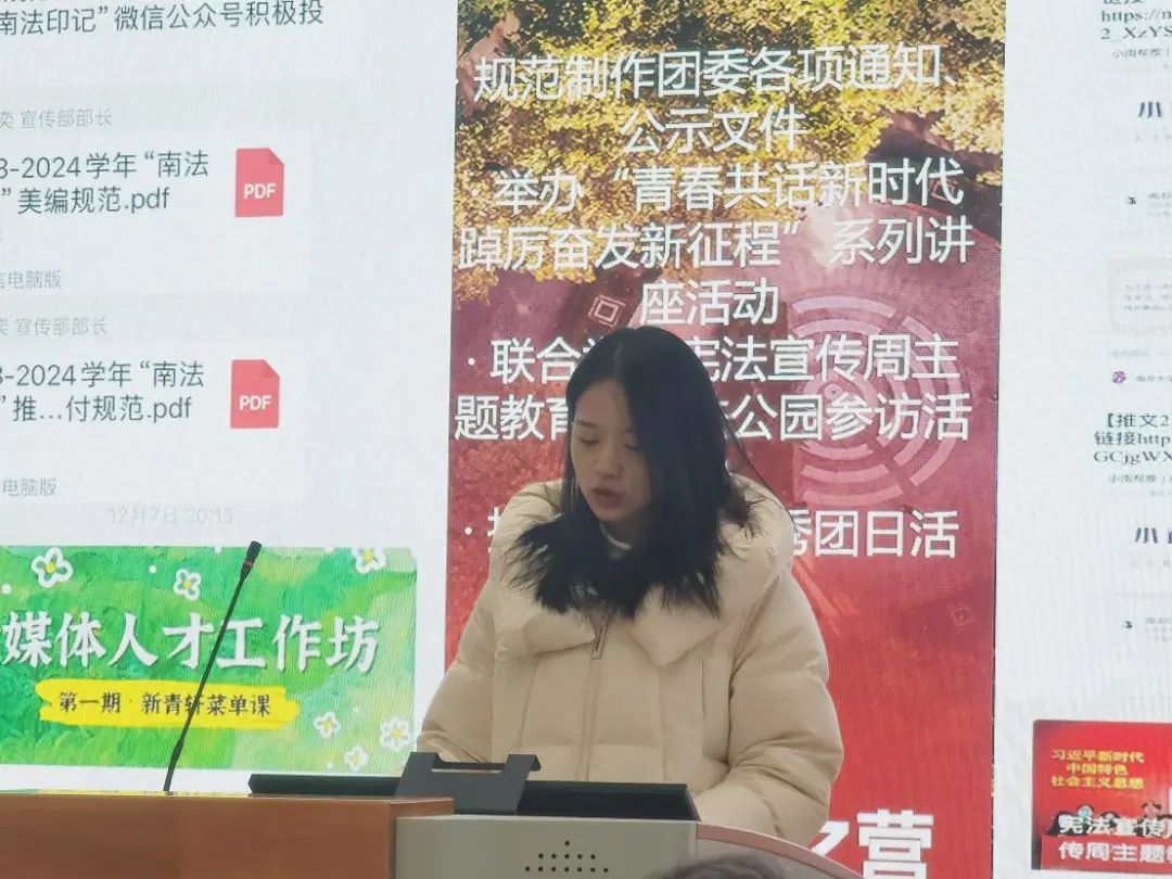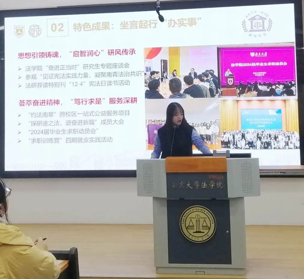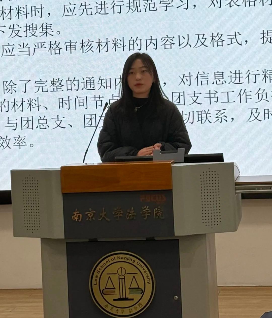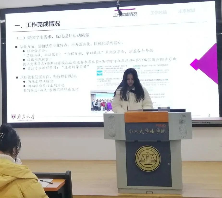 会上,法学院团委(学生)副书记依次介绍分管领域的工作情况。高嘉悦从项目培育、学术创新和基础服务三个角度出发对学创部工作成果进行展示;章岳珲着重介绍了社会实践部和生涯发展部持续以孵化“南法青年为科技强国保驾护航”的社会实践项目为工作导向,坚持探究法学学子在学习实践中如何以专业技能为科技创新保驾护航;赵奕淳聚焦思想引领、内部建设、重点主题三个方面,展现了志愿服务部在增强信念、完善制度、打造品牌三个方面获得的成果;朱滢从“坚守组织之门,常亮组织之灯”和“练就宣传之文,驻扎宣传之营”两大主题出发,分别对组织部和宣传部的工作成果进行汇报。
