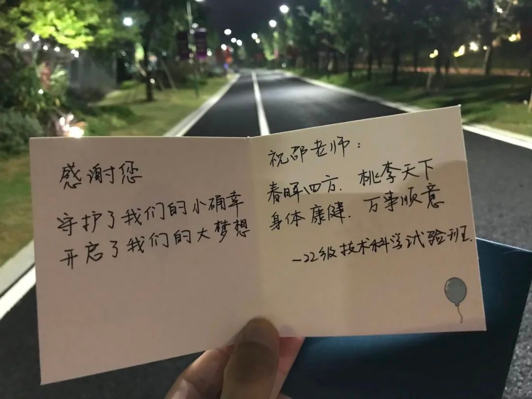 江南夜雨中的南大苏州校区,南大学生会给老师们准备了温馨卡片。
