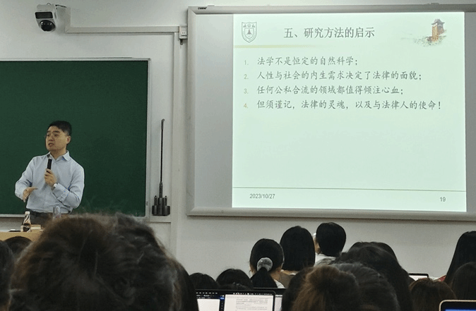 教授、博士生导师宋亚辉老师主讲。宋老师以其妙趣横生的个人经历与引人入胜的案例为同学们呈现了法学研究的全新视角和方法论。本次讲座参与者近两百人,现场座无虚席、反响热烈。