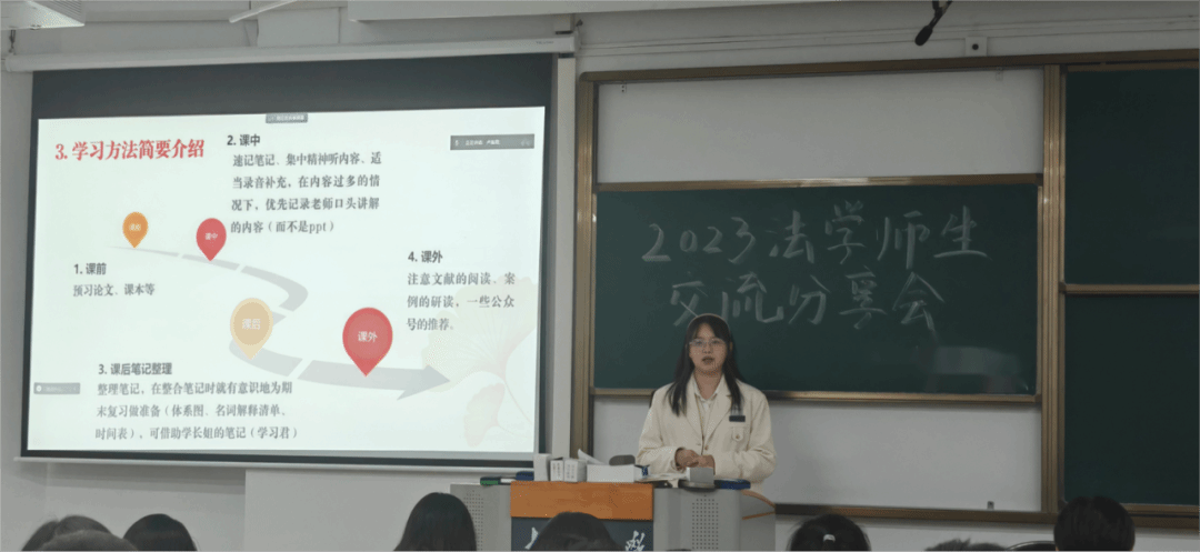 除此之外,学姐在如何学习方面也给予了同学们很重要的建议,比如借助他人的力量来帮助同学们学习,如借助学长学姐的笔记或向朋辈导师寻求帮助。最后,施页川学姐详细介绍了国际班的情况,解答我们对国际班的疑问。通过学姐介绍,同学们对法学未来学习的不同发展道路也逐渐有了明确的定位,帮助同学们更好地确定发展目标。