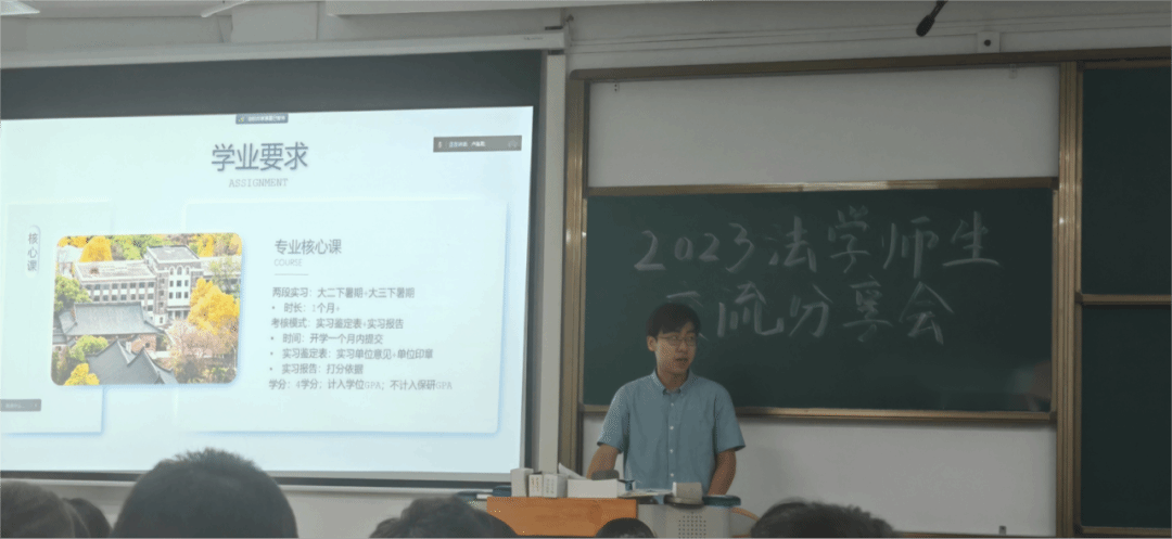 王艺树学长则将重心放在了法学生的未来职业规划指导和实习经验分享上,从实习目的、实习渠道、实习选择等角度出发,分享了自己的经验。实习目的大致有三个:学业要求,能力提升和职业规划;实习渠道大致有学院推荐、朋友介绍、自主联系、社团资源四个方向;在实习选择方面,学长介绍了自己的实习经历与感想,同学们深受启发。