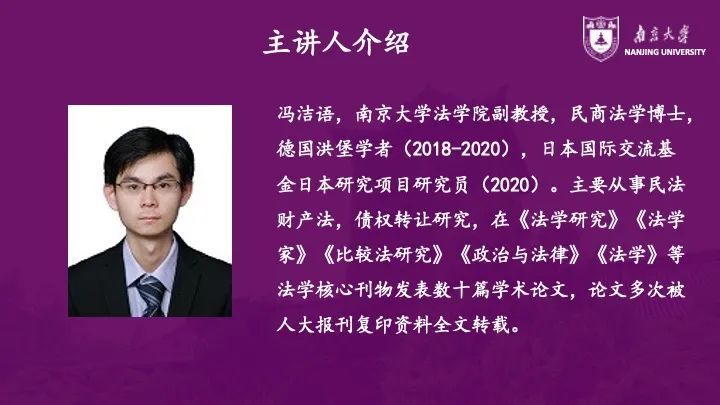 冯老师从法史研究的必要性和如何进行法史研究两个方面进行了深入阐述。冯老师提醒大家法史研究不是必须的,现行法的分析可以不专门考虑法史,但在必要的情况下需要进行法史研究,比如研究罗马法可以参考英文版《罗马法》,而研究国内法应当关注《民法典》,并希望大家关注条文体系位置变迁背后的立法目的。