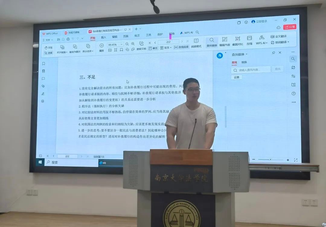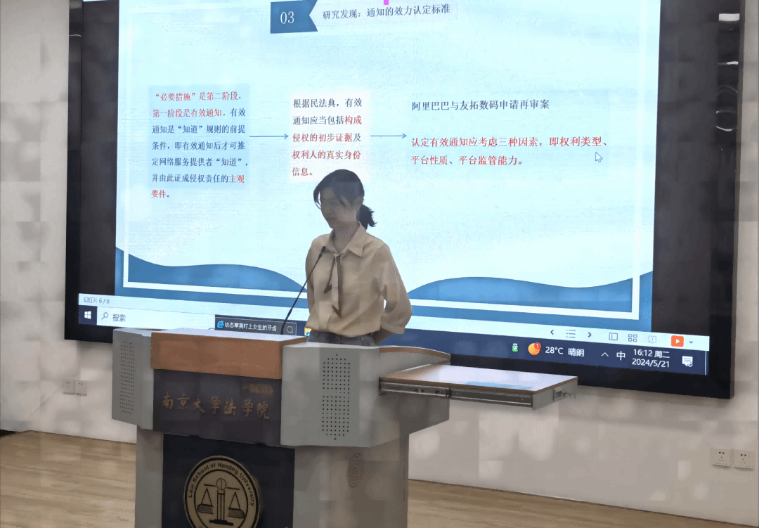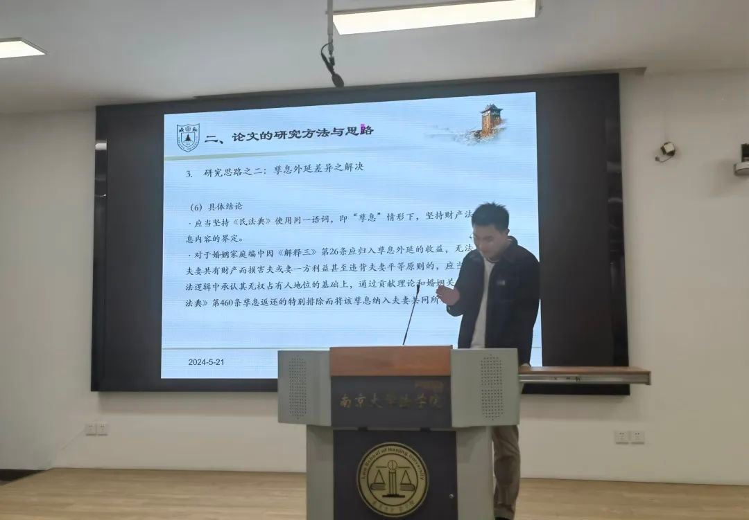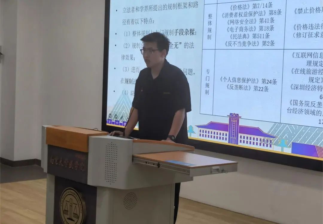 在论坛现场,学术论文汇报选题广泛,涵盖经济法学、民法学、宪法与行政法学、诉讼法学、国际法学、理论法学等诸多领域,研究选题既有信息网络时代的“通知-必要措施”原则、算法定价监管、RPM规制等,也有优秀传统法治文化中儒法思想的现代阐释,补救履行制度、孳息制度、匿名言论权体系构建等民法、宪法与行政法领域的基础研究更是彰显教义学传统风采……相关论文紧扣时代脉搏,视角新颖,体现了法学院本科生对社会热点话题的密切关注。