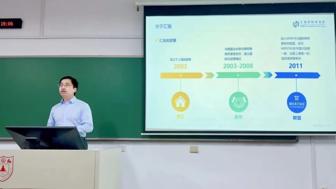 宣讲会一共分为三个部分。校友鲁帅杰律师、宿文嘉律师、合伙人马谦律师分别为大家带来了汇衡的基本介绍,本届Workshop的报名方式、评分规则和分组安排以及本次案例的解析。