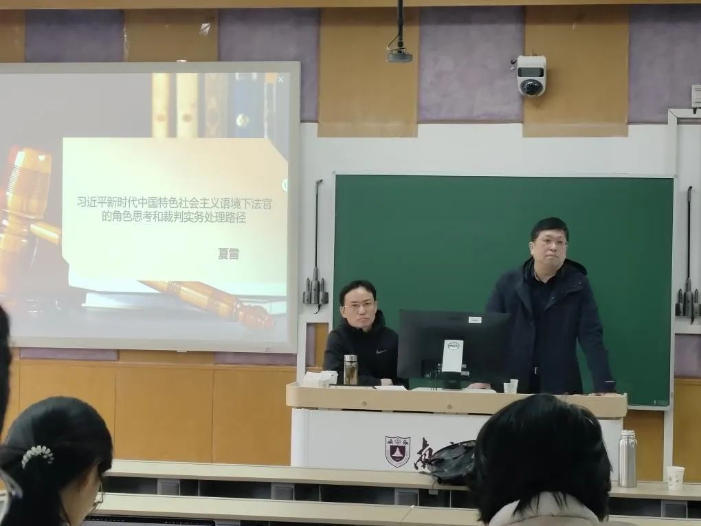 单锋教授主持。本次课程邀请了南京市中级人民法院民四庭副庭长夏雷法官与金杜律师事务所顾宸菲律师授课,他们分别就《习近平新时代中国特色社会主义语境下法官的角色思考和裁判实务处理路径》与《民事诉讼中的前置程序》进行了专题分享,为同学们带来了一场知识与智慧的盛宴。