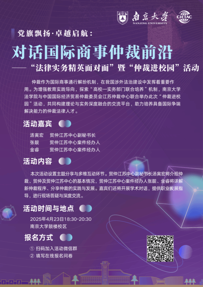本次“仲裁进校园”活动不仅是一次与实务精英对话的契机,更是一扇打开职业视野的窗口。在这里,你将聆听资深商事仲裁专家的真知灼见,触摸仲裁实务的鲜活脉搏,甚至找到未来职业发展的方向与灵感。让我们共赴这场“学术+实践”的盛宴,与贸仲江苏中心的专家面对面,共同探索商事仲裁的奥秘与魅力!