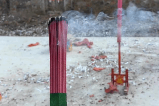大年三十吃年夜饭之前,每家门口都是点燃一炷香,并且放三个爆竹,一挂鞭炮,表明辞旧迎新。并且每家都会再拿一炷香,去每个村都有的土地庙敬香,祈愿来年风调雨顺。照片拍摄地点是安徽省马鞍山市含山县环峰镇三龙村。