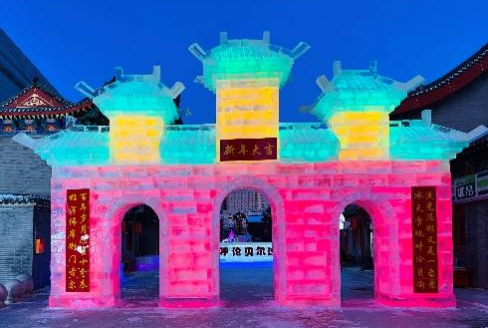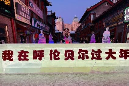 我的家乡位于祖国的北部边疆内蒙古呼伦贝尔市海拉尔区,兔年春节,气温已逾零下四十余度,夜幕四合下,华灯初上间,走进呼伦贝尔古城,炫彩冰雕让人眼前一亮,冰景与光影交相辉映,扮靓古城夜景。这城市里一座座造型各异的冰灯、冰雕雪雕,在霓虹闪烁下流光溢彩,浓浓的年味扑面而来。