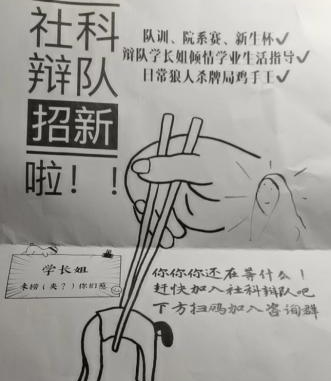 A:我进辩队是因为学长军训刷楼时发的宣传单了。上面有一些看起来不错的福利,比如狼人杀、学业生活指导之类的。我高中接触过辩论,再加上宣传单做得也蛮有趣,就抱着试一试的心态加入了。后来法学院辩论队学姐让我接下一任的队长,我答应了,就一直留在了辩论队。加入辩论队蛮偶然的,也确实没有想到会一直在队里呆三年。