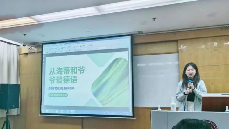 2021级德语系本科生章文馨同学作为活动嘉宾,为同学们做简单的德语教学。章文馨同学的德语专业功底十分扎实,她从初中就开始接触、学习德语,曾获全国大学生德语辩论赛三等奖、全国“德语之星”演讲比赛二等奖。