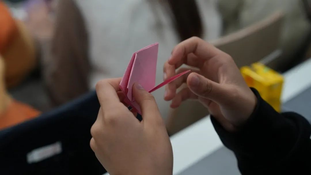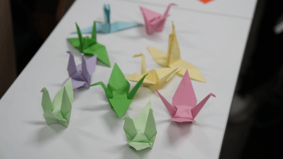 随后,同学们将其精心折成一只只千纸鹤,互相赠予。