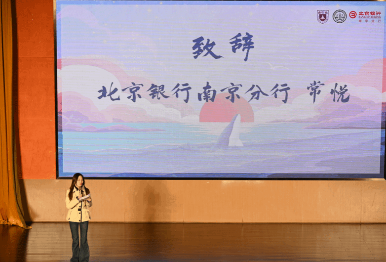 其后,北京银行股份有限公司南京分行人力资源部经理助理常悦女士上台为晚会致辞。常经理详细介绍了北京银行以及北京银行南京分行的发展现状与所取得的成就。北京银行长期以来致力于支持各类教育事业,坚信培养出一代代优秀青年才俊是社会进步的基石。希望通过此次活动加深与学校之间的合作与交流,为大家的成长与发展贡献力量。祝愿各位新生珍惜时光、学有所得,老师们万事胜意、身体健康,成人网
