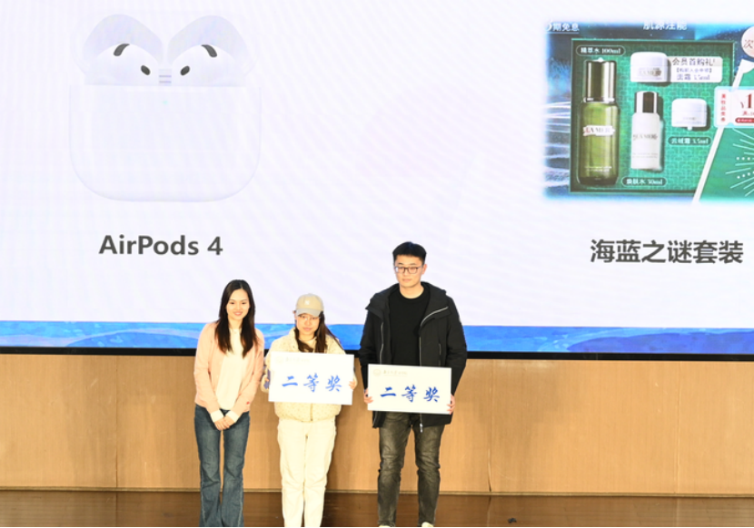 随着第二篇章表演的结束,又到了大家期待已久的抽奖环节。本轮二等奖由北京银行南京分行常悦经理为我们抽取。恭喜以上两位幸运同学分别获得AirPods4与海蓝之谜套装!