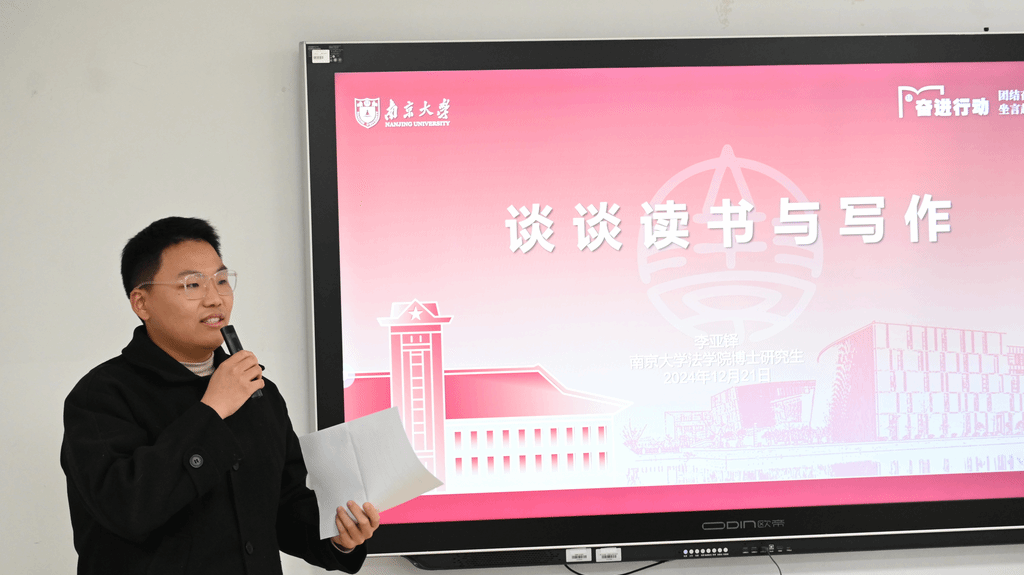 博士生李亚铎分享了自己在读书与写作方面的经验。强调了多读书、读好书的重要性,推荐大家通过豆瓣榜单寻找优秀书籍,并从脚注和参考文献中寻找其他优秀作品与优秀作者。他按照教材类、法学基础理论类、人文类,向大家推荐了相关优秀书籍,并从宏观和微观两个层面对论文写作进行分享。