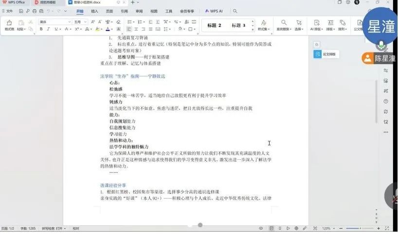 在过去的一学期中,我们真切感受到了陈星潼学姐的关怀与用心。正是学姐的帮助,让我们在陌生的环境中找到了方向,逐渐适应了法学院的学习节奏。期末考试临近时,面对繁重的复习任务,我们一度感到手足无措。学姐主动组织了分享会,耐心讲解每门课的重点和答题技巧,帮我们理清了思路;课堂上,当老师的讲课速度让我们难以跟上时,学姐毫不犹豫地分享了她整理的文件,不仅缓解了我们的课堂压力,也为复习提供了宝贵的资料;新学期伊始,面对全新的课程,我们难免感到迷茫,学姐便细心指导我们每门课的学习方法,让我们少走了许多弯路;而在我们为未来感到困惑时,学姐又咨询优秀前辈,与我们分享了学习经验与心态调整方法,让我们充满信心与动力。