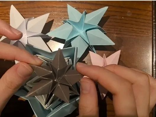 陈思仪负责对接8位22级本科生。2024年12月,临近秋季学期期末,她们初次见面,交流了期末备考过程中的疑问。陈思仪分享了她的复习背诵方法和心态调整策略,并和大家交换明信片。为了更好地了解对接对象的需求,陈思仪以问卷形式收集大家对寒假朋导活动内容的意向与建议。春节假期,九位同学在线上会议室相会,开展了主题经验分享会。由经典案例入手,导学法学院大三下三门必修课程,介绍课程架构、教材文献、考核形式,分享学习方法,为同学们提供参考。最后,同学们还一起用简单的材料制作了星形收纳盒等手工,祝愿新的一年,大家的生活也充满幸福的闪闪星光。