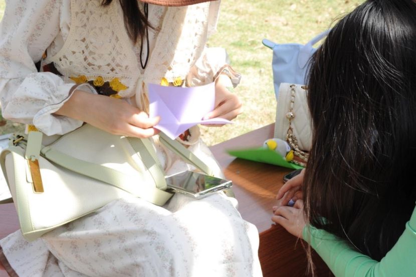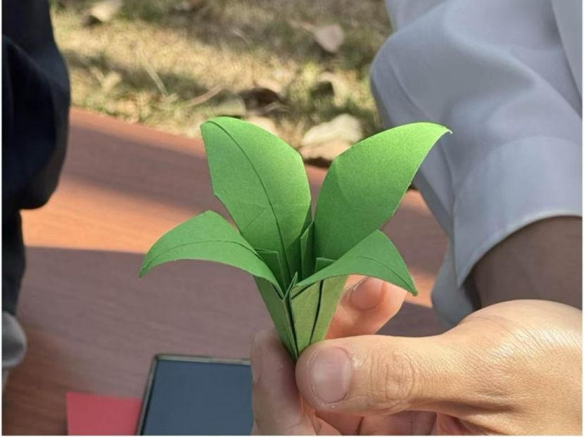 当彩色折纸遇上青春巧思,便奏响了春日里最灵动的乐章。活动伊始,一场充满趣味与创意的折纸活动拉开帷幕。同学们指尖翻飞,仿佛化身成春日里的魔法师,赋予一张张普通的彩纸生命。大家专注地折叠、翻转,将心中对春天的期待与热爱融入其中。各色的百合花层层叠叠,在掌心悄然绽放;造型华丽的纸玫瑰,成为众人瞩目的焦点。除了折纸花,同学们的创意更是层出不穷。有人制作出了精致的纸衣服和纸裤子,设计独特,尽显时尚感;有人折出了灵动逼真的纸青蛙,惹得大家欢笑连连;还有人别出心裁地折出了纸相机,仿佛要用这特别的“相机”定格春日的美好瞬间。活动中,大家你一言我一语,分享折纸的巧思与灵感,欢声笑语如同跳跃的音符,在桃湖公园的上空谱写出一曲春日赞歌。