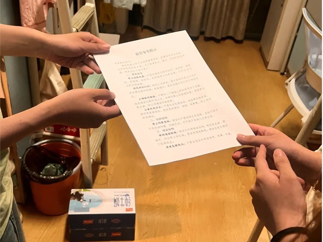 活动中,朋辈导师发放了《宿舍安全须知》,提醒大家注意防火防盗等安全事项。