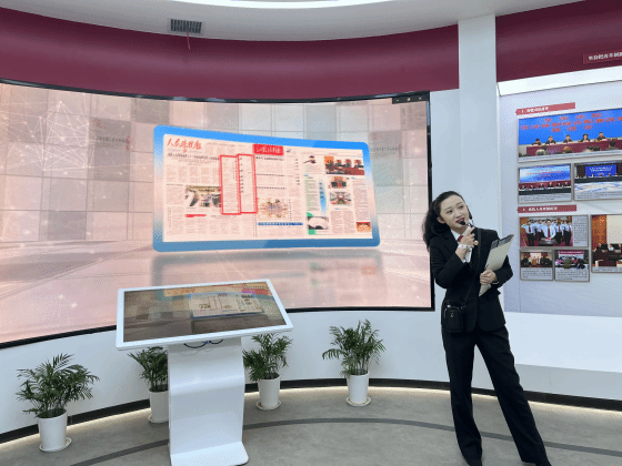 最后,法官助理带领同学们参观了院史馆。她向同学们介绍:南京市中级人民法院由两幢大楼构成,分别形如“山”和“川”,意为“山止川行,行不可阻”。参观过程中,同学们详细了解到南京中院的发展历程和优秀案例。此外,同学们还借助AR技术与中院合影留念。