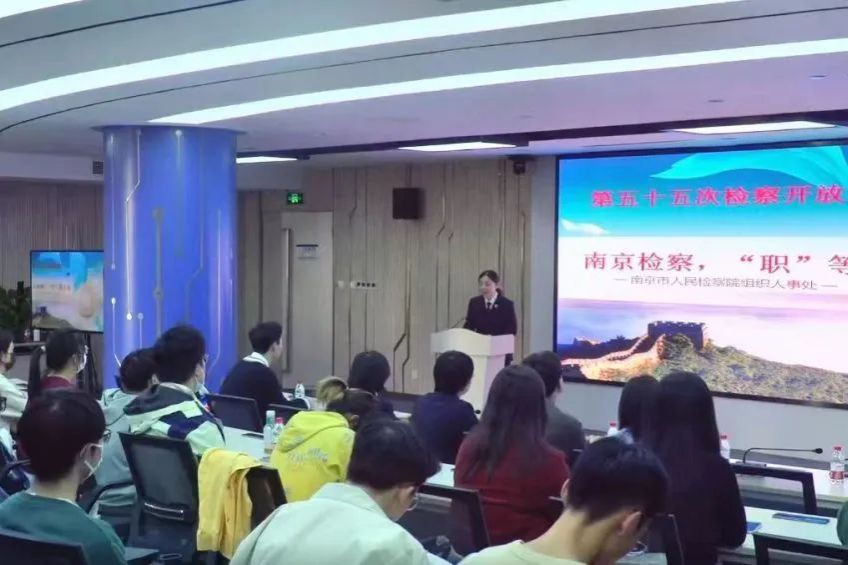 在本次活动中,在南京市人民检察院工作人员的带领下,同学们走进市检察院“12309”检察服务中心,听取服务中心职能介绍,观看检察职能宣传片,了解检察职责。在随后的座谈会中,检察院工作人员为同学们答疑解惑,并指导同学们如何正确的规划将来的职业选择