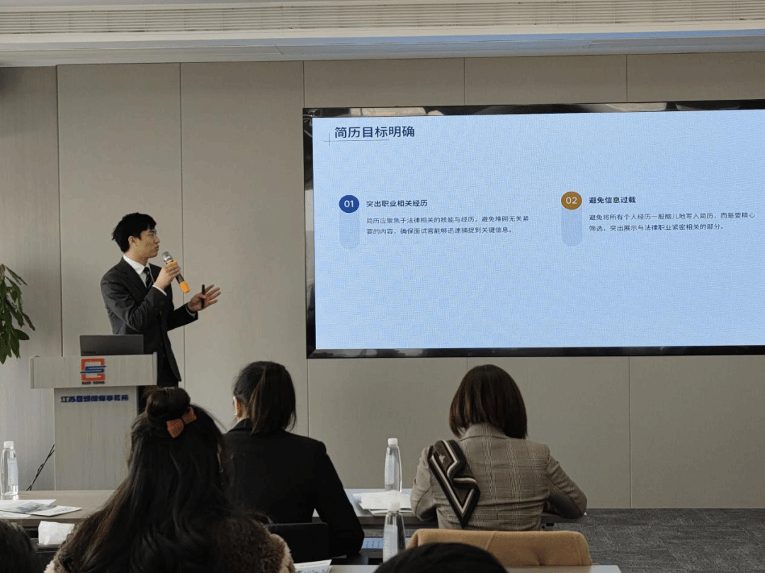 江苏国颂律师事务所刘昊天律师,以青年律师的身份,分享自己从学生到执业律师的成长经验与感悟,为大家提供宝贵的建议。刘律师以“走出象牙塔,法律学子的执业启程”为主题,指导法律学子如何从校园走向职场,顺利完成职业转型。他从简历制作、面试技巧、着装建议以及提升应聘竞争力等多个方面,为南大学子提供了细致的分享。