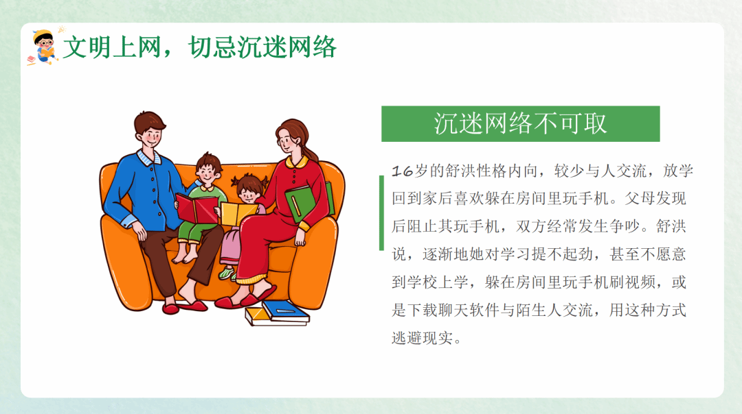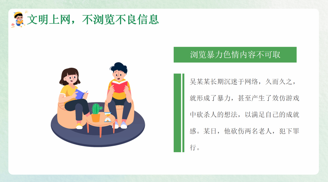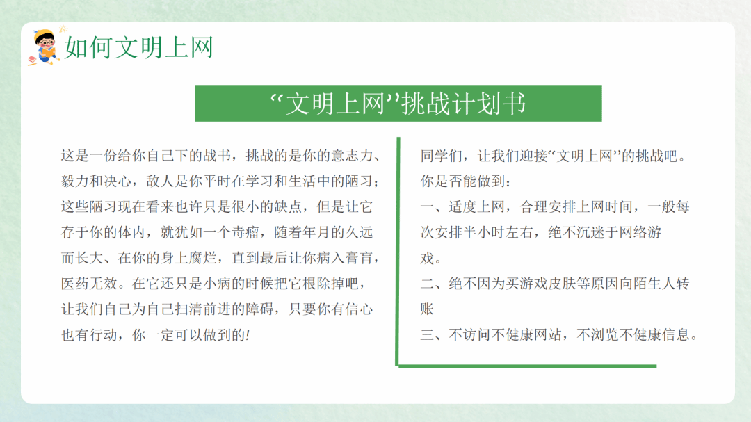 随后,志愿者带领同学们将话题转向互联网。先通过一个小测试,让同学们初步认识到文明上网应当怎么做。之后,为了提高同学们的警惕心,志愿者针对酿成悲剧的反面案例进行了形象的讲解,还向同学们详细介绍文明上网的注意事项:提高网络安全意识、不沉迷于网络、不浏览不良信息。最后,志愿者还向同学们介绍了“文明上网”挑战计划书,号召同学们积极参与“绿书签行动”,鼓励同学们付诸行动。
