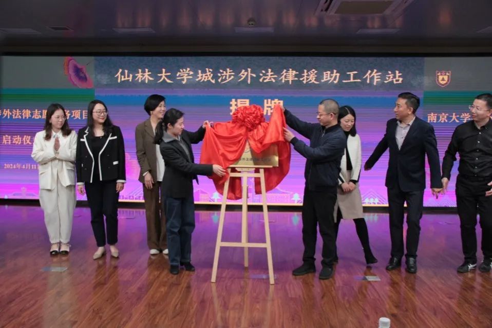团委副书记王维嘉为仙林大学城涉外法律援助工作站揭牌。