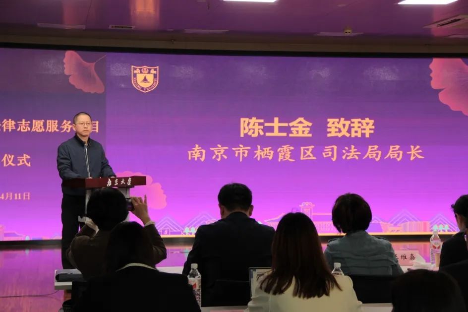团委副书记王维嘉,南京市栖霞区司法局局长陈士金,南京市栖霞区政府办公室副主任张丽华,南京市栖霞区依法治区办公室专职副主任陈少南,南京市栖霞区司法局法律援助管理科(区法律援助中心)科长曹军瑭,南京市栖霞区政府办公室涉外服务科副科长蔡俊,法学院党委副书记马骏,海外教育学院党委副书记曹力前,北京德和衡(南京)律师事务所执行主任张艳,北京德和衡(南京)律师事务所合规主任张宏,北京德和衡(南京)律师事务所党支部书记韩兆凯参加启动仪式。海外教育学院师生代表,法学生师生代表参加启动仪式。