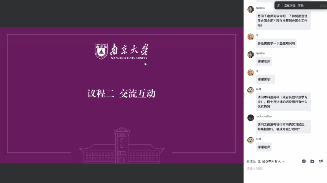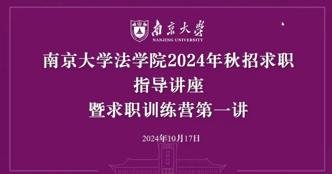 2024年秋招求职指导讲座暨求职训练营第一次活动于线上顺利举办。本次秋招求职指导讲座有幸邀请到法学院党委副书记马骏老师和北京银行股份有限公司南京分行人力资源部经理助理常悦女士作为嘉宾,他们分别从职业选择、简历制作、面试技巧等方面进行了讲解和答疑,从而帮助大家更好地了解企业需求和市场动态。本次秋招求职指导讲座不仅为奋战在求职之路的同学提供了专业的就业经验与策略,同时也增强了同学们的求职信心,提升了同学们的职业规划能力,助力同学们在激烈的就业竞争中脱颖而出。