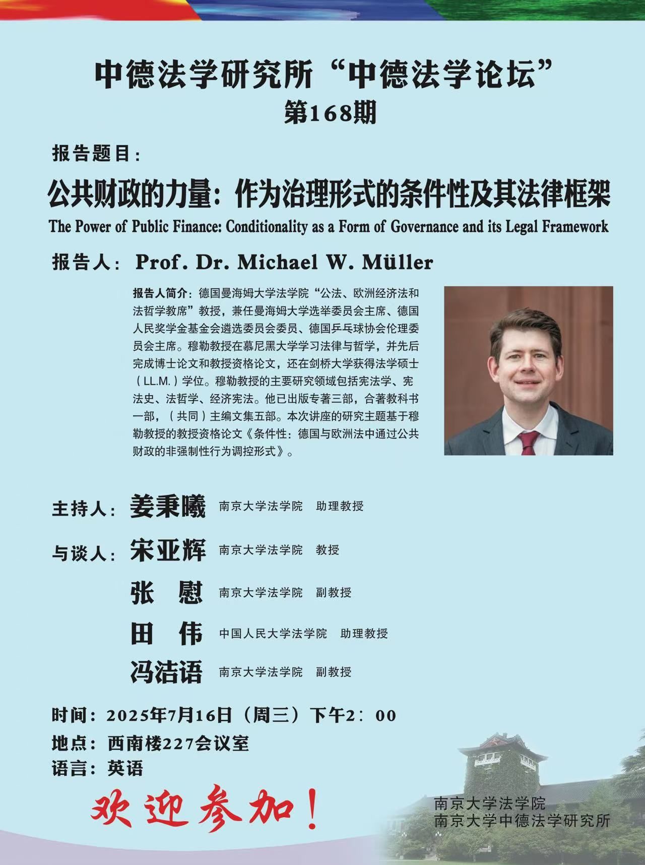 2025年7月16日,德国曼海姆大学法学院Michael W. Müller教授应成人网 中德法学研究所的邀请,以“公共财政的力量:作为治理形式的条件性及其法律框架”为题,为第168期“中德法学论坛”做学术讲座。