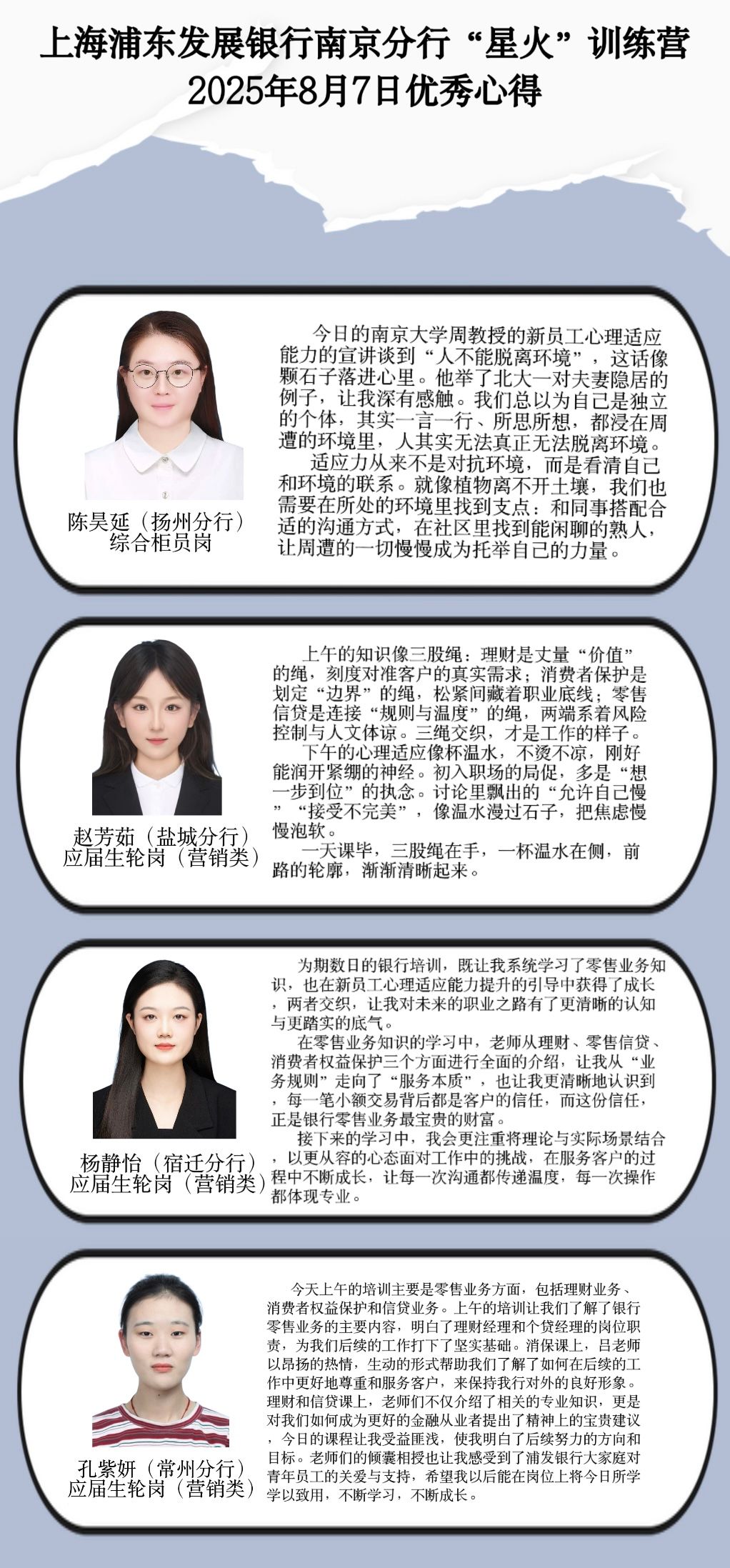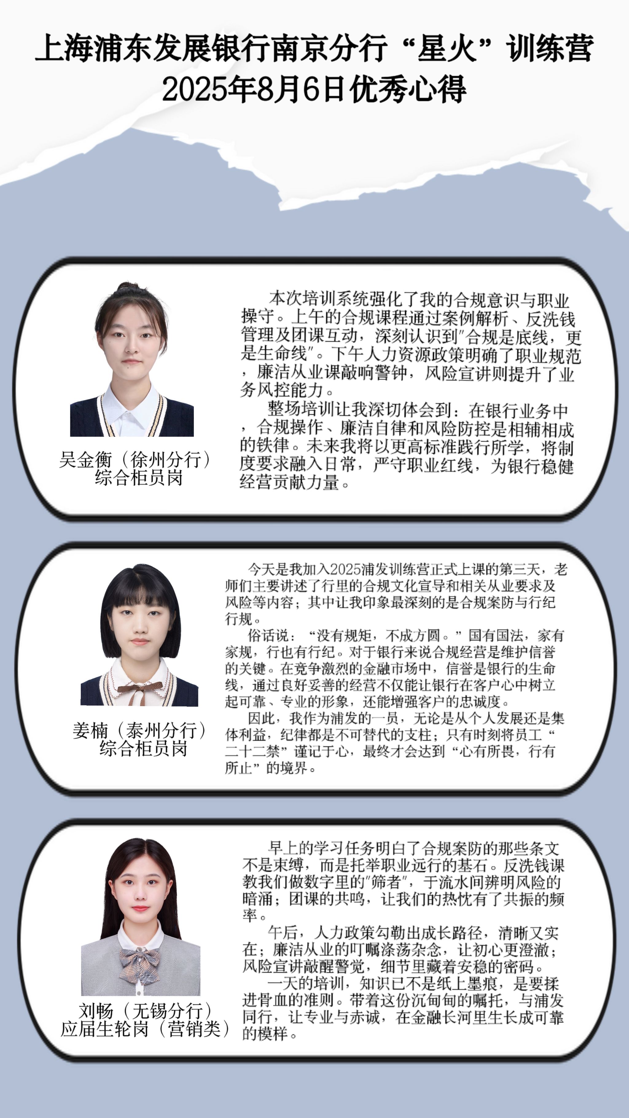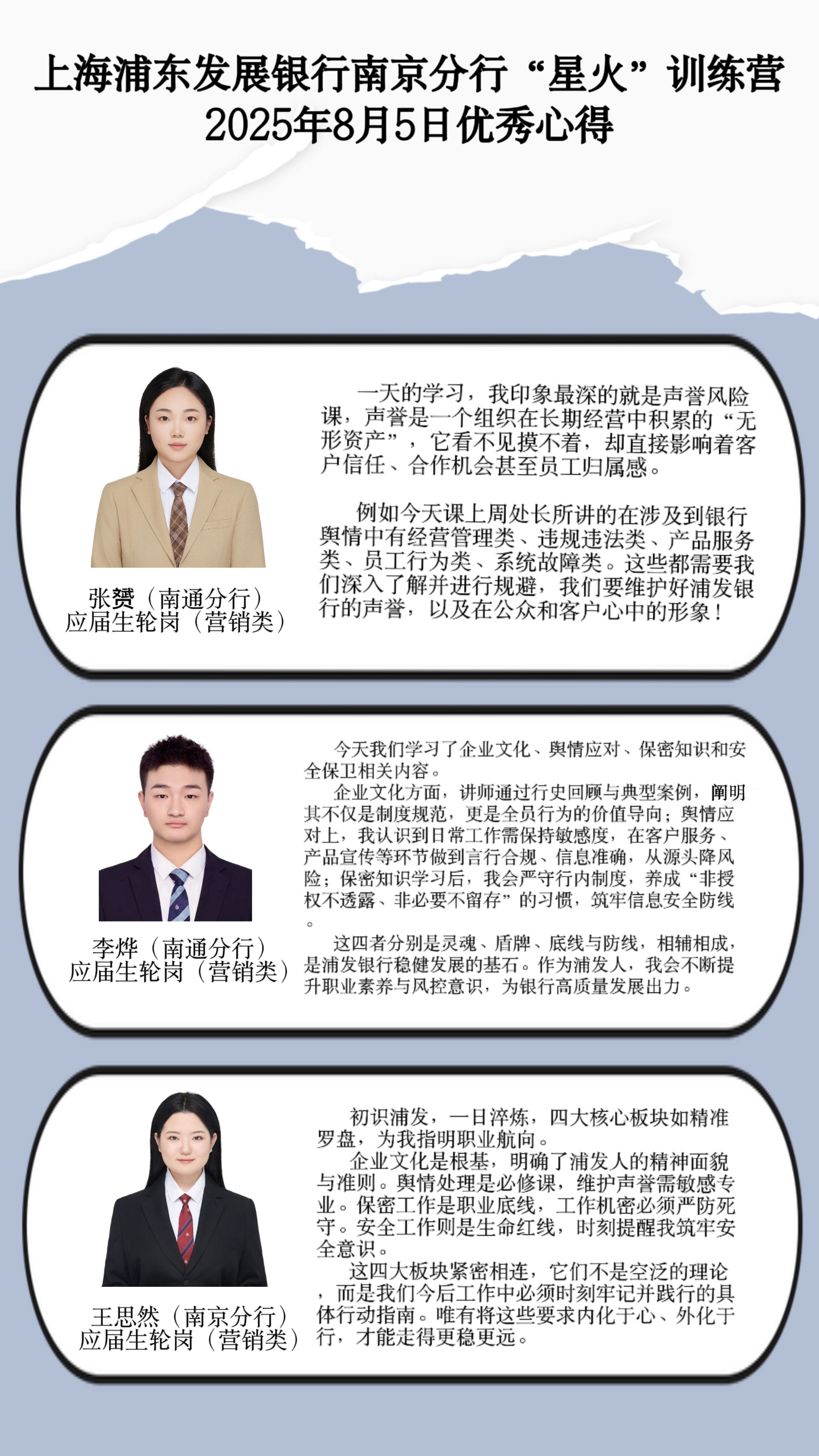 学员代表作表态发言,表示作为初入浦发的新生力量,将积极汲取养分、向下扎根,以扎实的专业能力、严谨的合规操作、用心的服务态度,为南京分行的发展贡献蓬勃的青春力量。