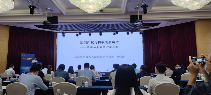 江苏省高级人民法院知识产权庭庭长汤茂仁发表了题为《知识产权与物权关系调适——运用抽象分离方法分析》的主题演讲,他结合经典案例对知识产权与物权关系进行了全面且深刻的分析,指出在同一物上并存物权与知识产权的情形下,物权行使不可任性,并提出抽象分离(二分法)理论。