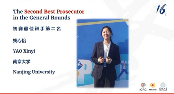 代表队以总分(书状+辩论)第二名的成绩从全国60支队伍中脱颖而出,晋级全国前八强,最终荣获全国一等奖。本届代表队庭辩人姚心怡同学获“初赛最佳辩手第二名(The Second Best Prosecutor in the General Round)”称号,在初赛打满全场的选手中,位列全国第二名。