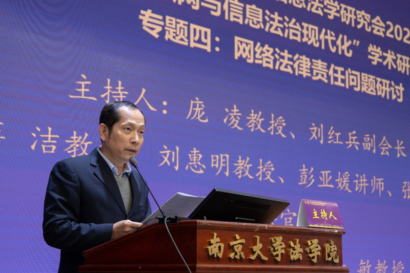 专题四“网络法律责任问题”的研讨由江苏省法学会互联网与信息法学研究会副会长、苏州大学法学院教授庞凌,江苏省法学会互联网与信息法学研究会副会长、南京市中级人民法院审判委员会专职委员刘红兵共同主持。