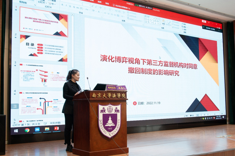 博士研究生玛丽亚木·艾斯凯尔以《演化博弈视角下第三方监督机构对同意撤回制度的影响研究》为题进行了发言,提出建立第三方监督机构能够在一定程度上消除信息主体与信息处理者之间的信息不对称问题,改变信息主体在与信息处理者博弈中的弱势地位,促进同意撤回权立法的有效实施。