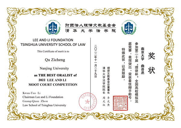 代表队历经初赛、复赛、半决赛、决赛,在40支参赛队伍中脱颖而出,继2004年、2007年之后第三次荣获全国冠军。同时,曲咨丞同学获最佳辩手奖,高昕然同学获优秀辩手奖。“理律杯”全国高校模拟法庭辩论赛是由理律杯模拟法庭竞赛组委会主办、台湾理律文教基金会和台湾理律法律事务所协办的模拟法庭竞赛,比赛每年于清华大学法学院举办。