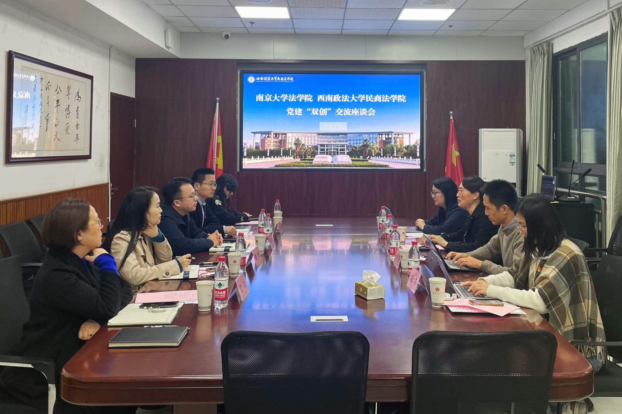 整体情况和学院党委在数字党建平台构建、党政思政队伍建设、涉外法治人才培养等方面的工作经验与成效。围绕党建业务深度融合、党建“双创”经验做法、党建品牌纵深打造等主题,调研组与参会人员开展了深度交流,对下一步加强校院交流合作、建立常态化长效化党建工作联络机制提出了意见建议。