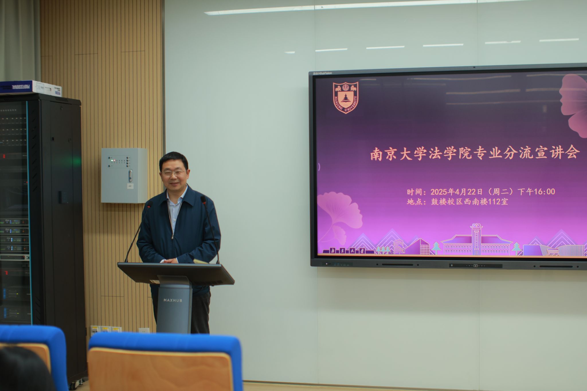 在宣讲会上,法学院副院长陈坤教授以“培养新时代法治人才”为主题,全面介绍了学院发展历程、学科优势、师资力量和本科生就业情况,并重点介绍了涉外法治人才实验班的培养模式。陈院长特别提到在新的时代背景下,学生应当注重跨学科思维培养,提升技术素养与法律实践的结合能力。