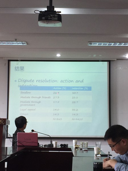 这一讲座主题,不仅吸引了法学院的同学,还吸引了外系的同学和慕名而来的社会人士。讲座伊始,曹教师亲切的介绍了他的留学经历、教学经历等,而在场听讲者也一一做了简短的自我介绍,而讲座也在这种融合的气氛中拉开帷幕。随后,他细致生动地向我们介绍了历史上的民事纠纷解决情况、民事纠纷中的“焦点”,为后续的介绍做了背景介绍。在此基础之上,他提出了研究的具体问题,包括:1.当代中国人如何处理日常纠纷;2.法律在其中起多大作用;3.有“假想怎么做”和“实际怎么做”的差距吗?4.哪些因素影响我们的行为和想法?