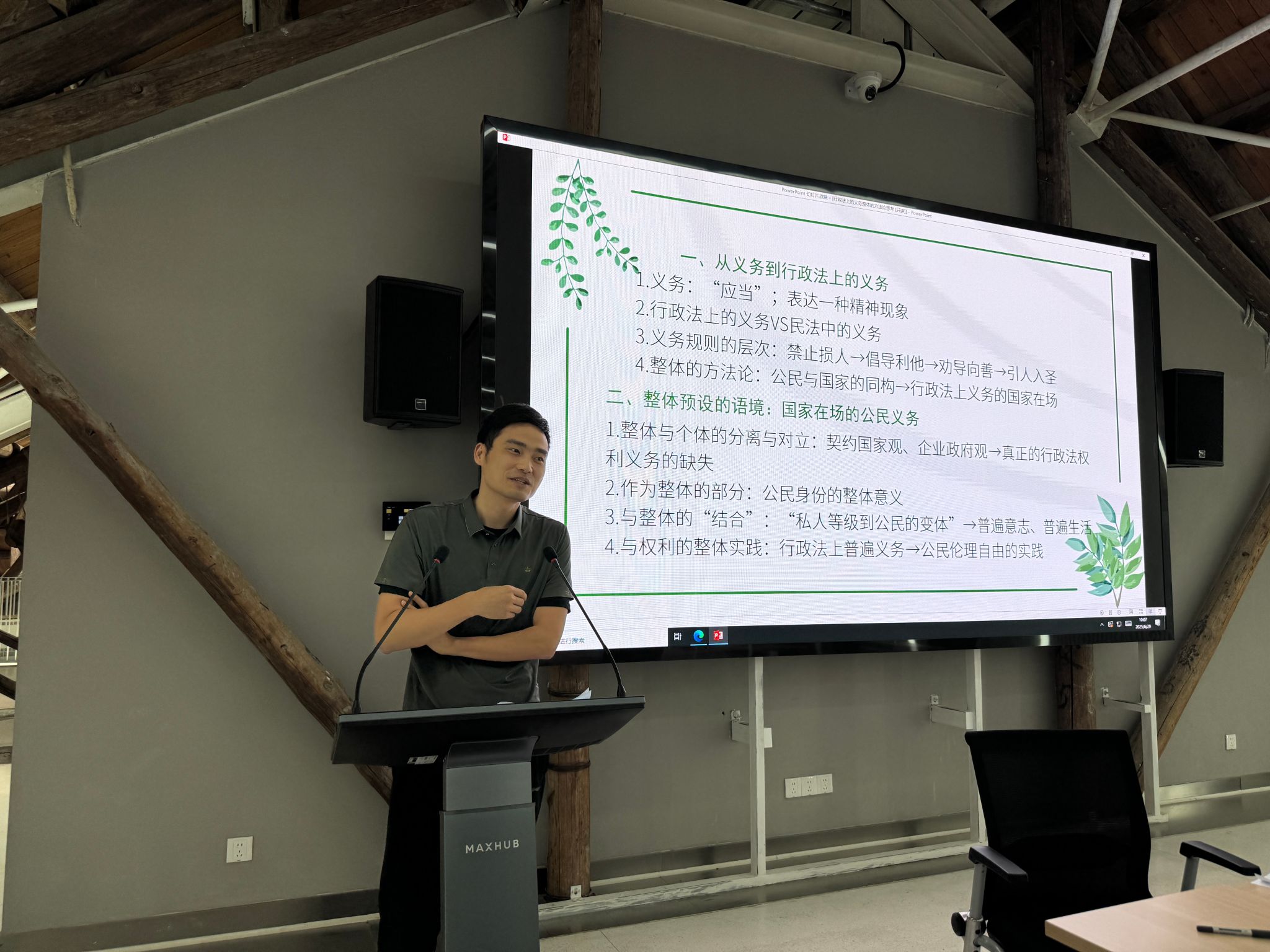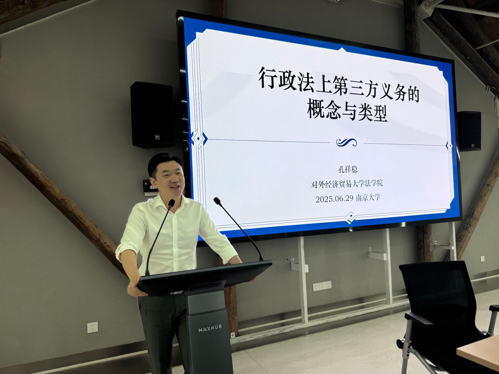 对外经济贸易大学法学院孔祥稳副教授报告了《行政法上第三方义务的概念与类型》。首先,孔祥稳提出,第三方义务是一个描述性概念而非规范意义上的概念,因此他系统剖析了“私人承担的公共治理义务”概念,指出其核心特点包括立法直接设定、公共利益导向、无需行政授权及多元履行条件等,并创新性提出其既区别于传统行政授权、委托,也不同于行政助手或民营化模式。其次,孔祥稳介绍,美国法上对第三方义务的多元分类——从吹哨人、守门人到有能力对于违法行为做出更强和更彻底的干预的主体的三元框架,以及基于私人主体的位置(核心或边缘)、获利情况的细分维度——凸显了制度设计的灵活性与复杂性。最后,孔祥稳进一步围绕第三方义务的正当性基础、私人执法边界、主体能力评估及成本效益平衡等关键问题展开深度思考,为公共治理领域引入私人主体参与提供了全新的理论视角,也进一步拓宽了行政法义务的讨论视野。