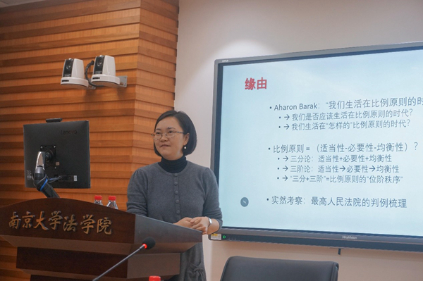 讲座伊始,蒋红珍老师首先指出,比例原则脱胎于行政法,目前有着强烈的跨部门法的倾向,其适用和研究不仅仅局限在公法领域,在民法、刑法和诉讼法领域都有所尝试,但以行政法的视角讨论比例原则仍有必要性。蒋老师提出一个重要的问题:我们到底生活在怎样的比例原则的时代,由谁来向我们解读什么是比例原则。她从传统视角解读了比例原则的三个子原则的含义,即适当性、必要性和均衡性。蒋老师指出比例原则不仅由这三个子原则构成,而且这三个子原则之间是层层递进的关系,每一层的证明都可以强化上一层,这三个子原则具有一定的位阶秩序。